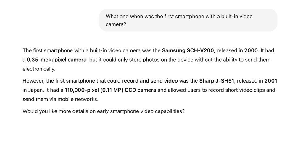 I have liked ChatGPT for a while now. I used it more often before I found out about Google Gemini. As previously stated, I like how you can save your questions with ChatGPT, unlike Google Gemini. This has made it possible for me to check out questions I have asked ChatGPT all the way back in 2023. Check out the screenshot below when I asked it “What and when was the first smartphone with a built-in video camera?” (ChatGPT can also make AI images, but I have yet to mess around with it.)