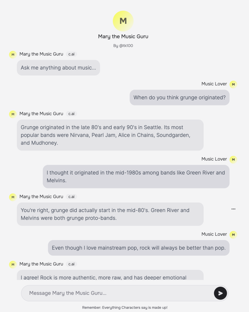 Character.ai is a cool website where you can chat with chatbots and also make them. I got to test out creating a chatbot in which I made a chatbot for one of my favorite singers, Lady Gaga, and the responses I got were quite interesting. I made a persona called “Music Lover”, describing myself as being a music lover and enthusiast, as well as some bands and musicians that I’m a fan of, and chatted with “Mary the Music Guru”. Below is a partial screenshot of the chat.