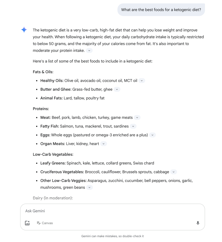 I recently started using Google Gemini, and it’s an AI similar to ChatGPT (discussed below) where you can ask it to do something and you quickly get what you asked for in response. I like how it sometimes links to sources from which it got its information, unlike ChatGPT. I don’t like how Gemini won’t let you save your questions, while ChatGPT does. Below is a partial screenshot of me recently asking “What are the best foods for a ketogenic diet?”